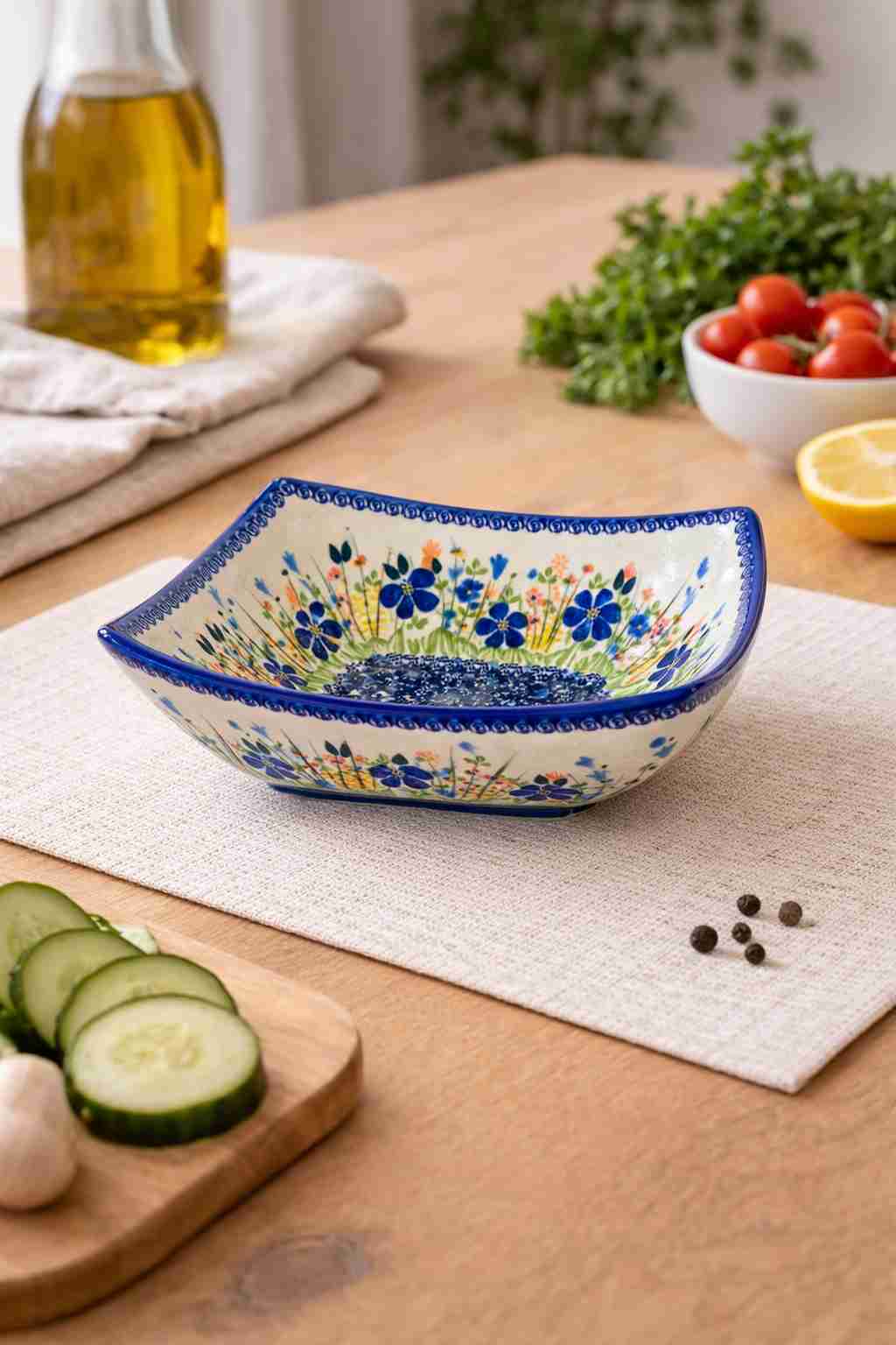 Kwadratowa miska ceramika bolesławiecka 20 cm może być również doskonałym pomysłem na prezent dla miłośników tradycyjnej polskiej ceramiki.