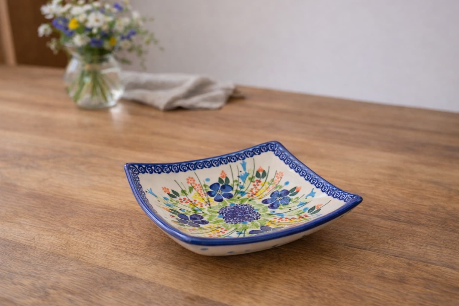 Kwadratowy kształt i wymiary 13 × 13 cm sprawiają, że miska świetnie nadaje się do sałatek, owoców czy kolorowych przekąsek. Ceramika bolesławiecka jest wytrzymała. Możesz ją bezpiecznie myć w zmywarce, a ręcznie malowane zdobienia pozostaną intensywne przez lata.