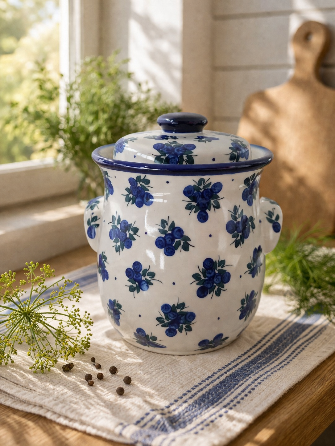 Pojemnik ozdobiony jest jedną z piękniejszych zdobin zakładu w jagody. Produkt należy do drugiego gatunku, co oznacza, że posiada drobne niedoskonałości, które nie wpływają na jego funkcjonalność i są często nawet niezauważalne na pierwszy rzut oka. To dobra okazja, aby kupić ceramikę bolesławiecką w niższej cenie.