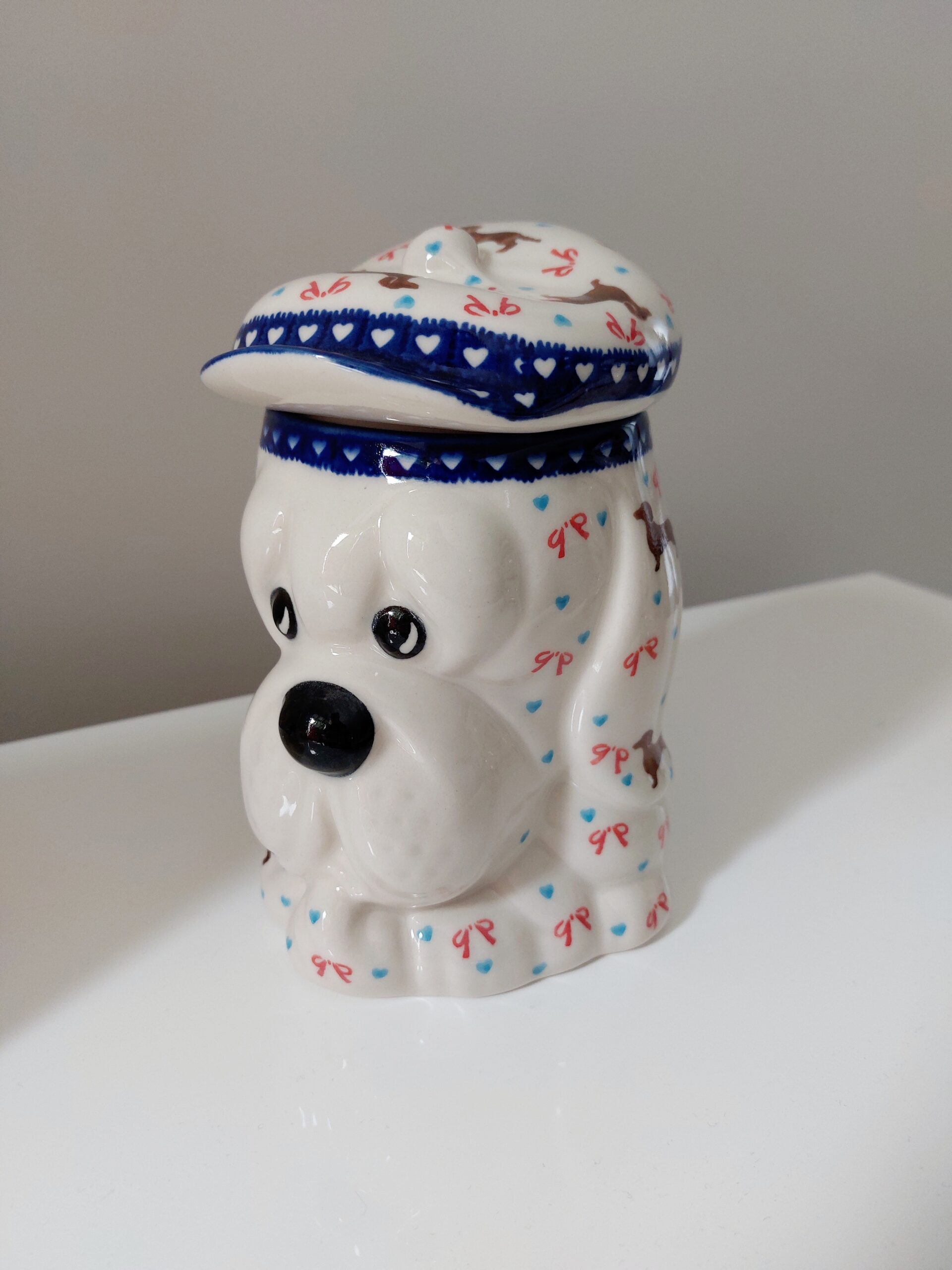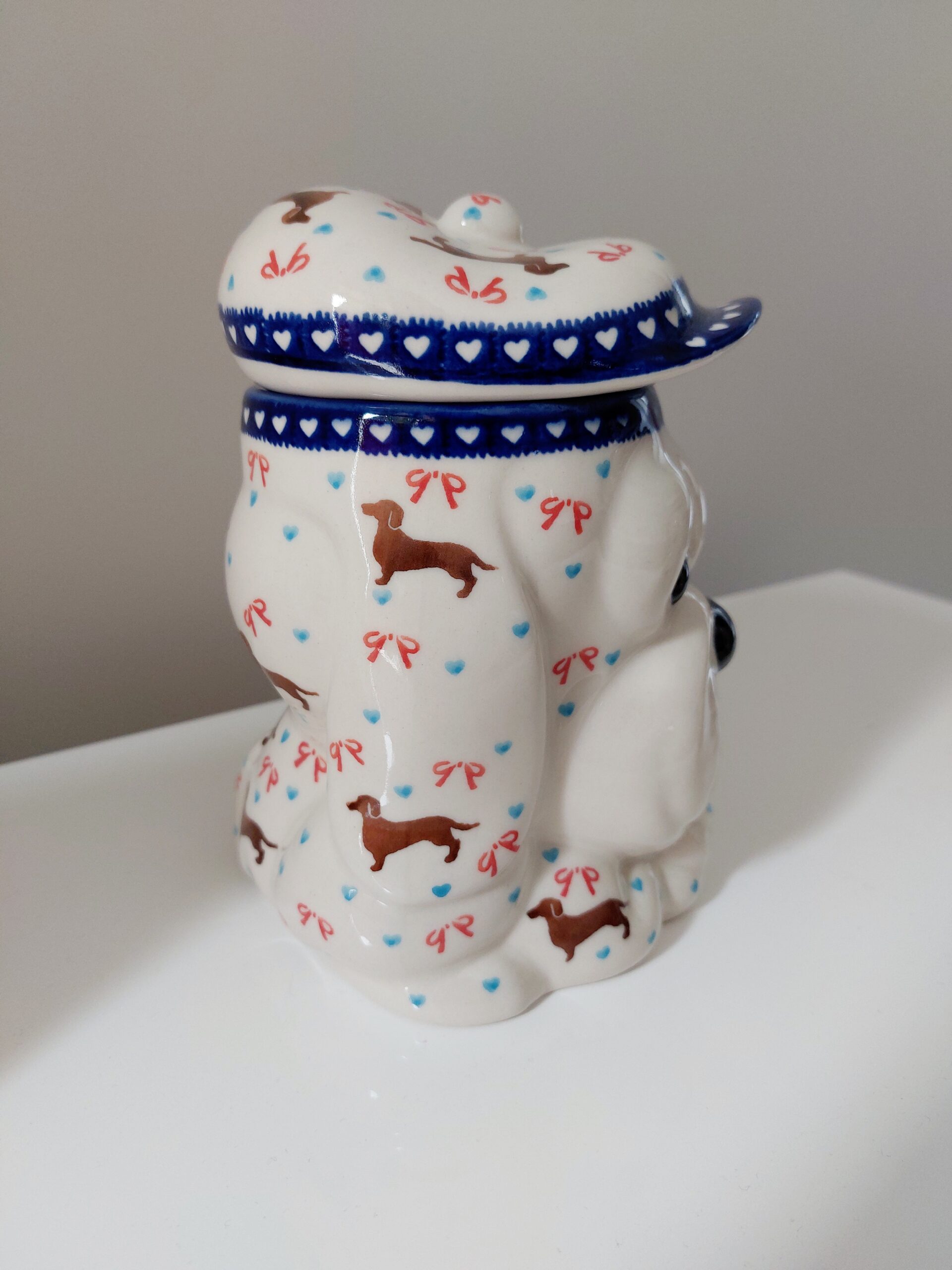 Pojemnik wyróżnia się oryginalnym kształtem pieska oraz uroczą dekoracją w jamniczki. Produkt należy do drugiego gatunku, co oznacza drobne niedoskonałości, które nie wpływają na jego funkcjonalność, a nawet czasem są niezauważalne na pierwszy rzut oka. To dobra okazja, aby kupić ceramikę bolesławiecką w niższej cenie.