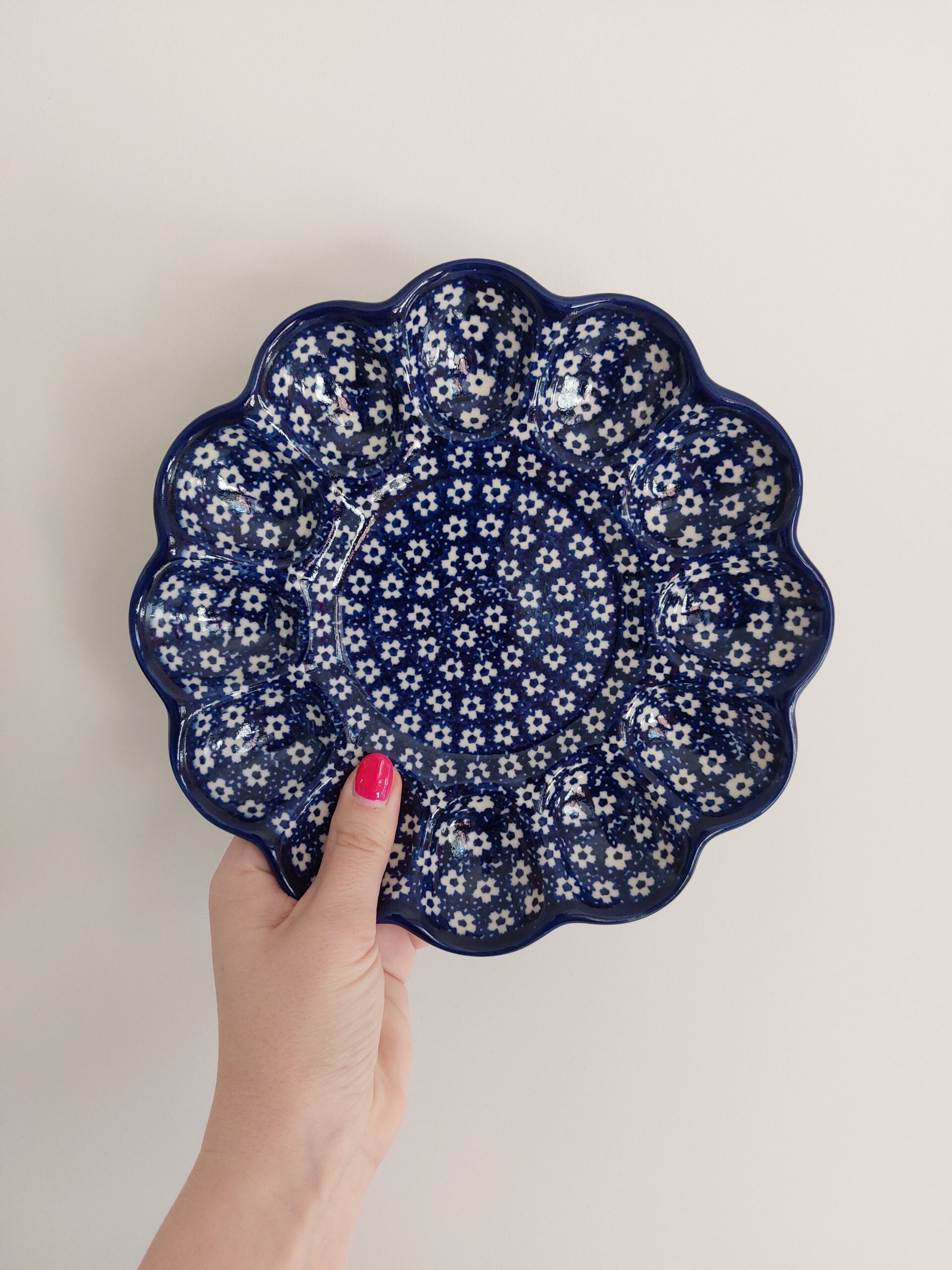 Talerz do serwowania jajek z oryginalnej, bolesławieckiej ceramiki. Dekoracja nr 3 to drobne kwiatuszki w kobaltowym kolorze. Talerz jest wygodny w użyciu, środek można wykorzystać na różne dodatki do jajek lub położyć mniejszą miseczkę na sos. Doskonale sprawdzi się nie tylko od święta, ale i na co dzień przy rodzinnych spotkaniach przy stole. Talerz można bez obaw myć w zmywarce.